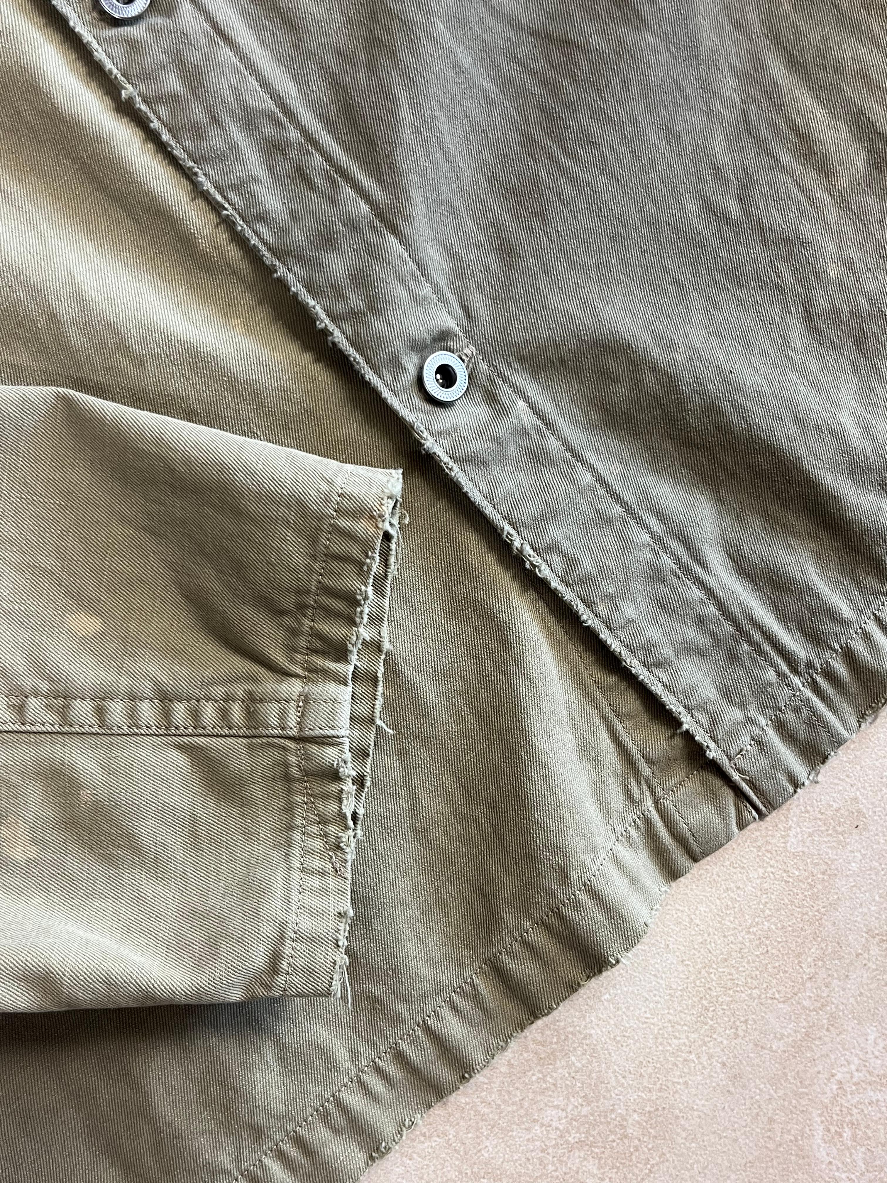 가장 마음에 드는 가공은 이 탈색 디테일이다. 얼룩 사이사이에 불규칙적으로 탈색된 부분이 빈티지한 느낌을 확 주는 것 같다. 그리고 소매와 밑단 모두 헤져있는 모습이다. 처음엔 조금 과하지 않을까 싶었는데 입어보니 오히려 자연스러운 효과가 났다.