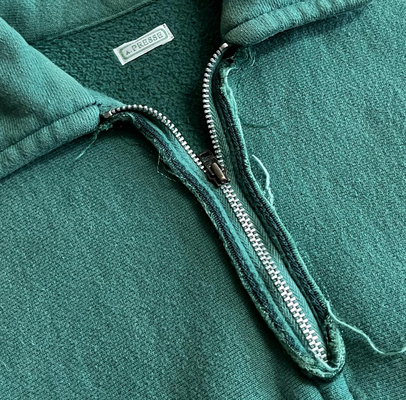 아무래도 하프 집업 스웻이다보니 지퍼 부분에 정체성이 다 담겨있다. 10년은 입은 것 처럼 지퍼 주변의 원단은 헤지고 실밥이 풀려있다. 엄마가 보면 이런거 입냐고 정리해줄 것 같은 비주얼.. 하지만 우리는 이게 아프레쎄의 맛이라는걸 알고 있으니까
